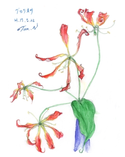 プチうんちく:Gloriosa は、ラテン語の gloriosus(見事な)が語源。別名、百合車(ゆりぐるま)。花言葉は、天分。